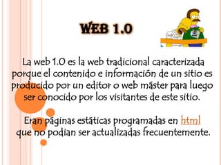 La Web 1.0 se caracterizaba por páginas estáticas en HTML actualizadas infrecuentemente por editores, mientras que la Web 2.0 permite a los usuarios interactuar y publicar contenido dinámico que puede actualizarse según sus necesidades. Ambas versiones de la Web consideraban importante atraer visitas y ofrecer una buena presentación visual.