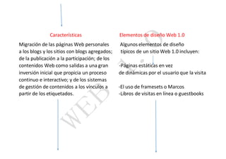 La Web 1.0 se caracterizaba por ser unidireccional y tener contenidos estáticos que no se podían actualizar fácilmente. Las primeras páginas web publicaban texto que no podía modificarse a menos que el webmaster subiera de nuevo toda la página. La Web 1.0 tenía un carácter principalmente informativo y las empresas empezaron a usarla con diseños limitados debido a las limitaciones tecnológicas.