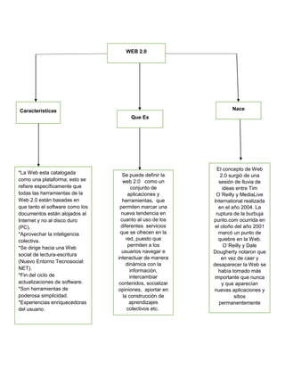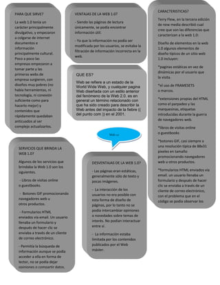 La web 1.0 se refiere a la primera fase de la World Wide Web, caracterizada por páginas estáticas utilizadas principalmente para la divulgación de información cultural, con interacciones de usuario limitadas. A pesar de sus desventajas, como la falta de actualización de contenido y la falta de interacción, permitió encontrar información útil de manera pasiva. En contraste, la web 2.0, surgida en 2004, introdujo interactividad y la posibilidad de colaborar y socializar a través de herramientas y aplicaciones en línea.