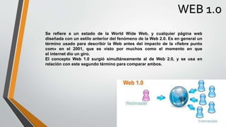 La Web 1.0 se refiere a la primera etapa de la World Wide Web caracterizada por páginas estáticas creadas principalmente por desarrolladores. La Web 2.0 promueve la participación de los usuarios a través de blogs, redes sociales y contenido generado por los usuarios, permitiendo la interacción y colaboración en línea. Algunas características distintivas son el uso de marcos en la Web 1.0 versus contenido dinámico en la Web 2.0 y el modelo de solo espectador en la Web 1.0 frente a usuarios activos