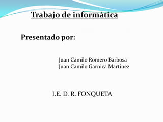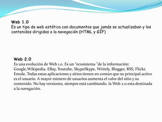 El documento compara la Web 1.0 y la Web 2.0. La Web 1.0 consistía en páginas web estáticas con contenido que nunca se actualizaba, mientras que la Web 2.0 es más dinámica y centrada en el usuario, permitiendo que los usuarios contribuyan y compartan contenido. Algunas características clave de la Web 2.0 incluyen sitios web que pueden usarse completamente desde un navegador, la existencia de enlaces, el uso de marcado semántico como XHTML y formatos micro, y el apoyo a la