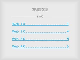 El documento describe las diferentes versiones de la World Wide Web. La Web 1.0 era de solo lectura y permitía poca interacción del usuario. La Web 2.0 facilitó el compartir y crear contenido generado por los usuarios a través de comunidades y redes sociales. La Web 3.0 se refiere a la evolución del uso de la red a través de inteligencia artificial y semántica web. Finalmente, la Web 4.0 podría integrar la Web 3D, voz e inteligencia para que dispositivos y personas se comuniquen y tomen decisiones de forma