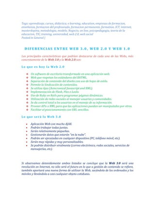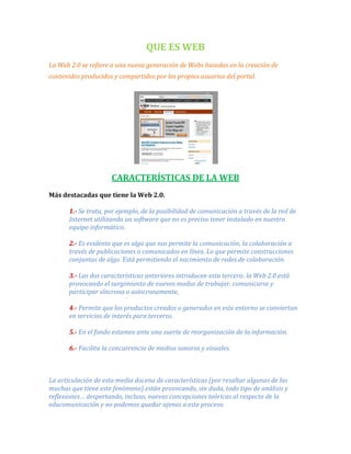 La Web 2.0 se refiere a una nueva generación de sitios web que permiten a los usuarios crear y compartir contenido. Algunas características clave incluyen la comunicación y colaboración en línea entre usuarios, el surgimiento de nuevas formas de trabajar y participar de manera síncrona o asíncrona, y la capacidad de que los contenidos creados por usuarios se conviertan en servicios para otros. La Web 3.0 se basará aún más en aplicaciones web dinámicas con AJAX que podrán interactuar entre sí y gest