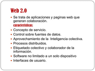 Web 2.0 se refiere a aplicaciones y páginas web que permiten la colaboración entre usuarios a través del almacenamiento y descarga de contenido, agregación de noticias y entradas de blog, redes sociales y sitios web editables por múltiples usuarios. Los servicios de Web 2.0 incluyen comunidades virtuales dedicadas a la música y redes sociales donde personas con intereses similares pueden interactuar. Picasa permite subir fotos a cuentas de Google mediante la descarga e instalación del programa y la creación o inicio