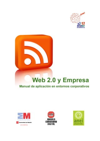Este documento es un manual sobre la Web 2.0 y su aplicación empresarial. Consta de 10 capítulos escritos por diferentes autores y organizaciones que tratan temas como la Web 2.0 y su aplicación empresarial, el diseño web, la publicidad online, los medios de comunicación digitales, el e-learning, la administración pública, las redes sociales profesionales, los blogs y la empresa, y la comunicación corporativa. El objetivo del manual es ayudar a las empresas a entender mejor el concepto de la Web 2.0 y sus implicaciones para los mode