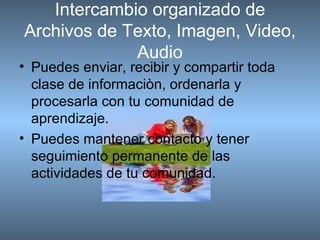 El documento describe las herramientas de software de Web 2.0 que permiten el aprendizaje social y colaborativo, como la sindicación, la socialización, el seguimiento y la elaboración colaborativa de documentos. Estas herramientas permiten a los usuarios enviar, recibir y compartir información en varios formatos con su comunidad de aprendizaje, y mantener el contacto y el seguimiento de las actividades de dicha comunidad. El documento también señala que Web 2.0 ofrece utilidad y funcionalidad para un estilo de aprendiz