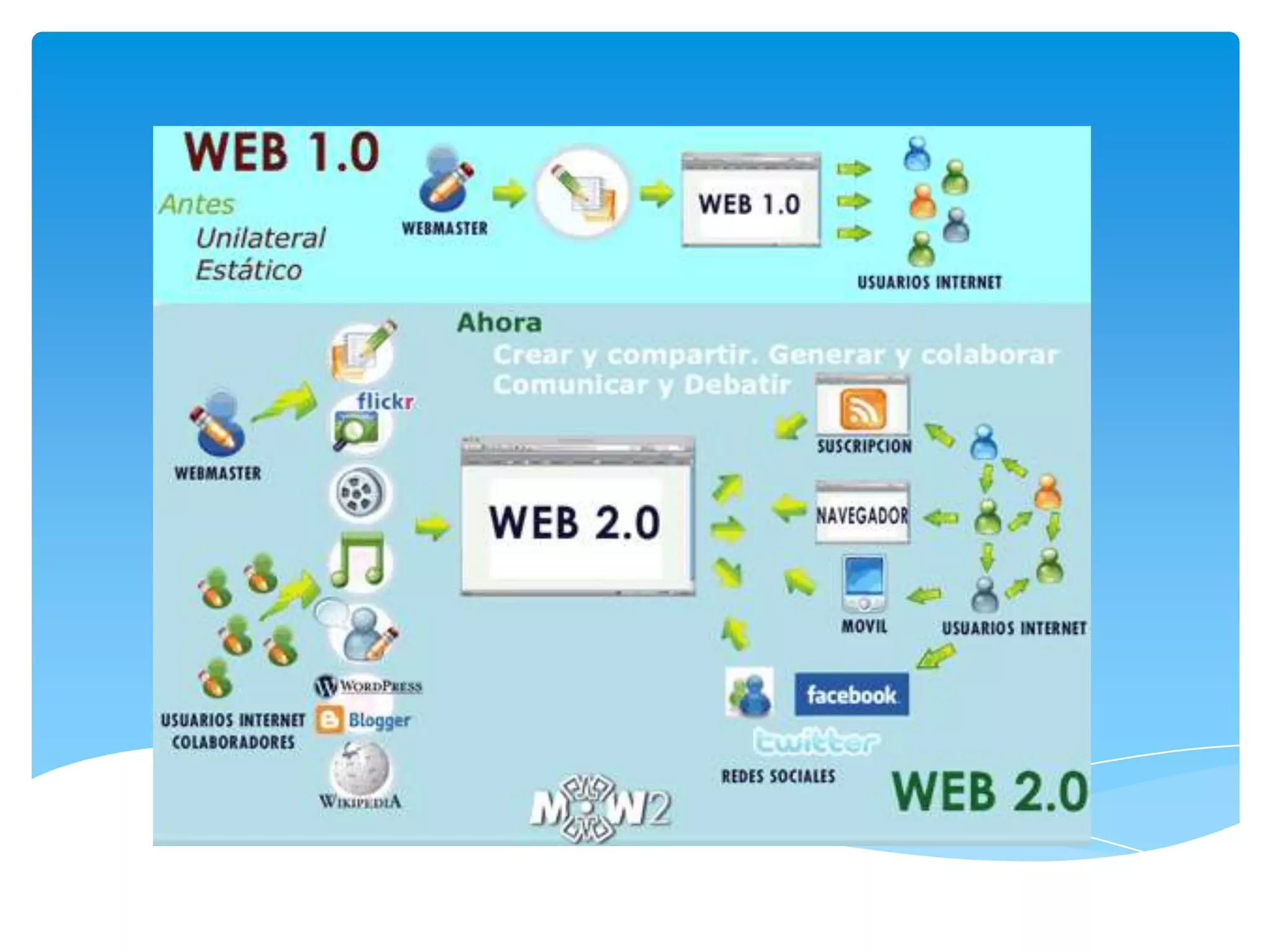 El documento describe la evolución de la Web 1.0 a la Web 2.0, caracterizada por sitios web más dinámicos e interactivos que facilitan el compartir y la colaboración entre usuarios. La Web 2.0 se basa en aplicaciones como blogs, wikis, redes sociales y servicios de alojamiento que permiten a los usuarios publicar y comentar contenido generado por otros.