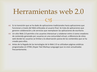 El documento describe las herramientas de la Web 2.0, que permiten a los usuarios interactuar y colaborar generando contenido, a diferencia de sitios web estáticos. Entre las ventajas se encuentran que los usuarios generan contenido ahorrando costos, se fidelizan creando lazos comunitarios, y pueden rentabilizarse mediante publicidad. Algunos desafíos son que los usuarios no están preparados para participar, requiere tiempo de moderación, y puede haber riesgos legales por el contenido generado por los usuarios.