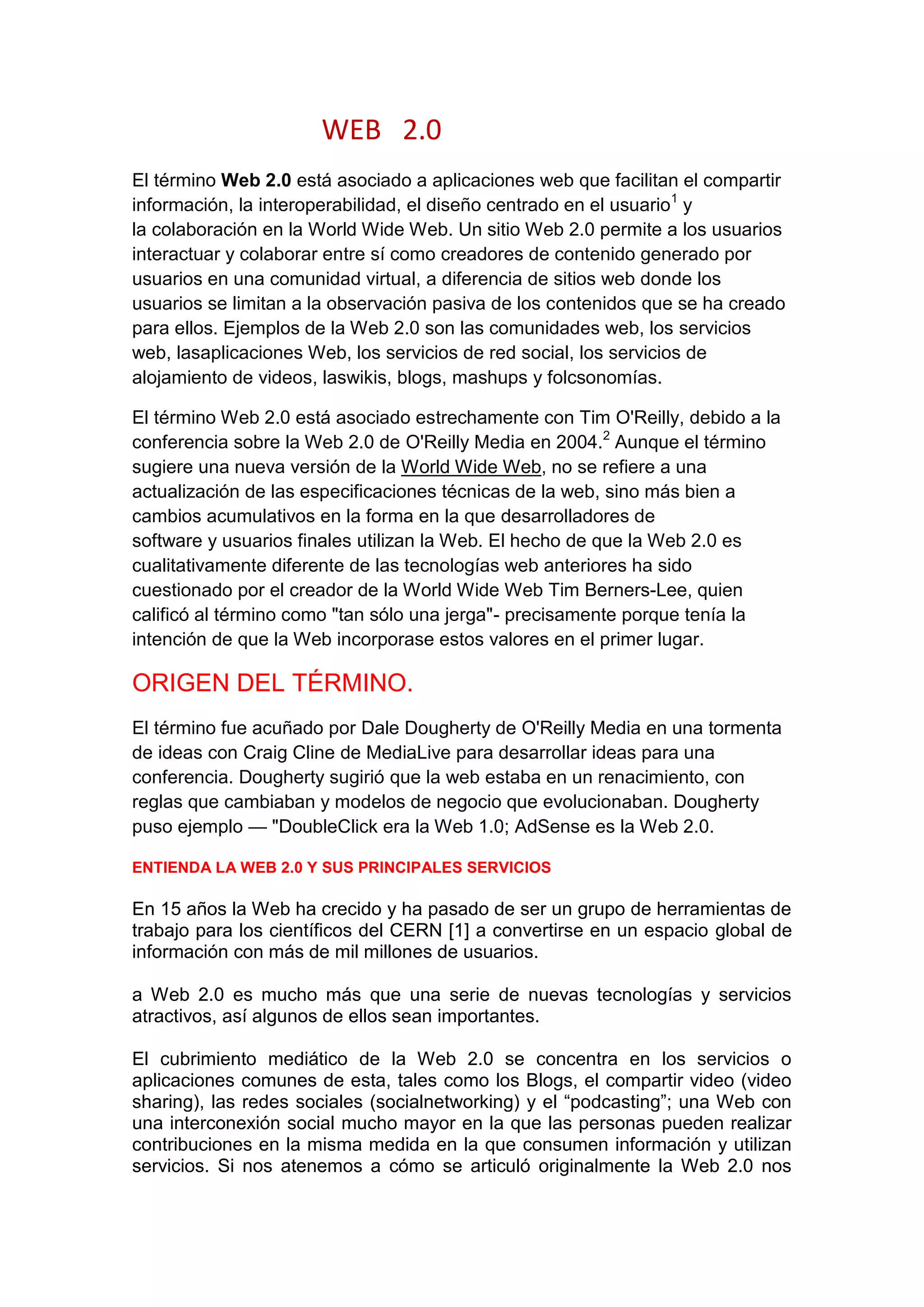 La Web 2.0 se refiere a aplicaciones web que facilitan el compartir información y la colaboración entre usuarios para crear contenido. Algunos ejemplos son comunidades web, redes sociales, wikis y blogs. El término fue acuñado en 2004 para describir cambios en cómo los desarrolladores y usuarios usan la web, enfocándose más en la interacción y generación de contenido por los usuarios. La Web 2.0 permite a los usuarios interactuar y colaborar como creadores de contenido en lugar de limitarse a observar