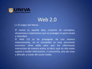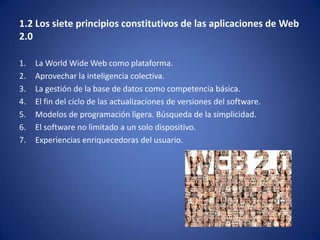 El documento describe la evolución del Web 2.0 y sus principales características. El Web 2.0 se ha propagado rápidamente permitiendo que los usuarios interactúen activamente y creen contenido en lugar de solo consumirlo. Algunos principios clave del Web 2.0 incluyen aprovechar la inteligencia colectiva y experiencias enriquecedoras para los usuarios. El documento también analiza aplicaciones como redes sociales y herramientas para organizar información de manera colaborativa.
