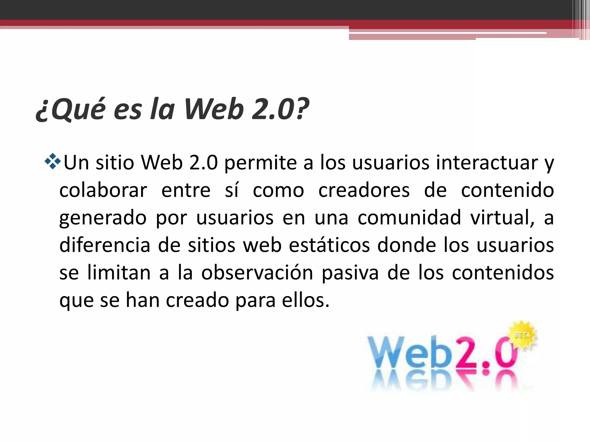 El documento describe la Web 2.0 y sus características principales. Un sitio Web 2.0 permite a los usuarios interactuar y colaborar como creadores de contenido en una comunidad virtual, a diferencia de sitios estáticos. La Web 2.0 sugiere una nueva versión de la World Wide Web que se basa en cambios acumulativos en cómo los desarrolladores y usuarios usan la web, haciéndola cualitativamente diferente de tecnologías web anteriores. Herramientas como blogs y wikis permiten compartir contenido de