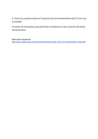 El documento discute la importancia de incluir herramientas web 2.0 a nivel gubernamental, empresarial y académico debido a las ventajas que ofrecen para realizar acciones en diferentes ámbitos y acercar a los usuarios a la investigación. Explica que países como Estados Unidos, Canadá, Australia y Colombia han adoptado las redes sociales como medios de comunicación efectivos. También describe cómo Colombia ha encontrado que las redes sociales han sido útiles para que los ciudadanos obtengan información del gobierno sobre temas de su interés,
