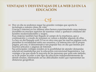 El documento describe las ventajas y desventajas de la web 2.0 en la educación. Algunas de las principales ventajas son que las herramientas son fáciles de usar, fomentan el trabajo colaborativo, y permiten el acceso a la educación independientemente de la ubicación geográfica. Algunas desventajas son la posible falta de comunicación entre profesores y estudiantes, el aislamiento social que puede ocurrir, y la necesidad de equipos y recursos técnicos.