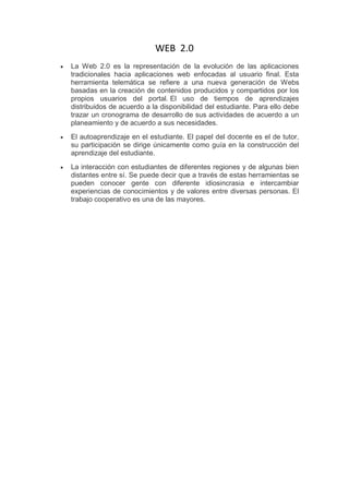 La Web 2.0 se refiere a una nueva generación de páginas web que se enfocan en el contenido generado por los usuarios. Permite el autoaprendizaje de los estudiantes a través de actividades trazadas en un cronograma y con el tutor como guía. También facilita la interacción entre estudiantes de diferentes regiones para conocerse e intercambiar experiencias y conocimientos.
