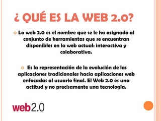 La Web 2.0 se refiere a la evolución de la web hacia una versión más interactiva y colaborativa, donde los usuarios tienen un doble rol como protagonistas y público de la información. Las características clave incluyen que el software y la información se almacenan en internet en lugar de las computadoras locales, y que permiten compartir todo tipo de contenido a través de lenguajes estandarizados. Algunas tecnologías clave que impulsan la Web 2.0 son Ajax, Flash, redes sociales y APIs.