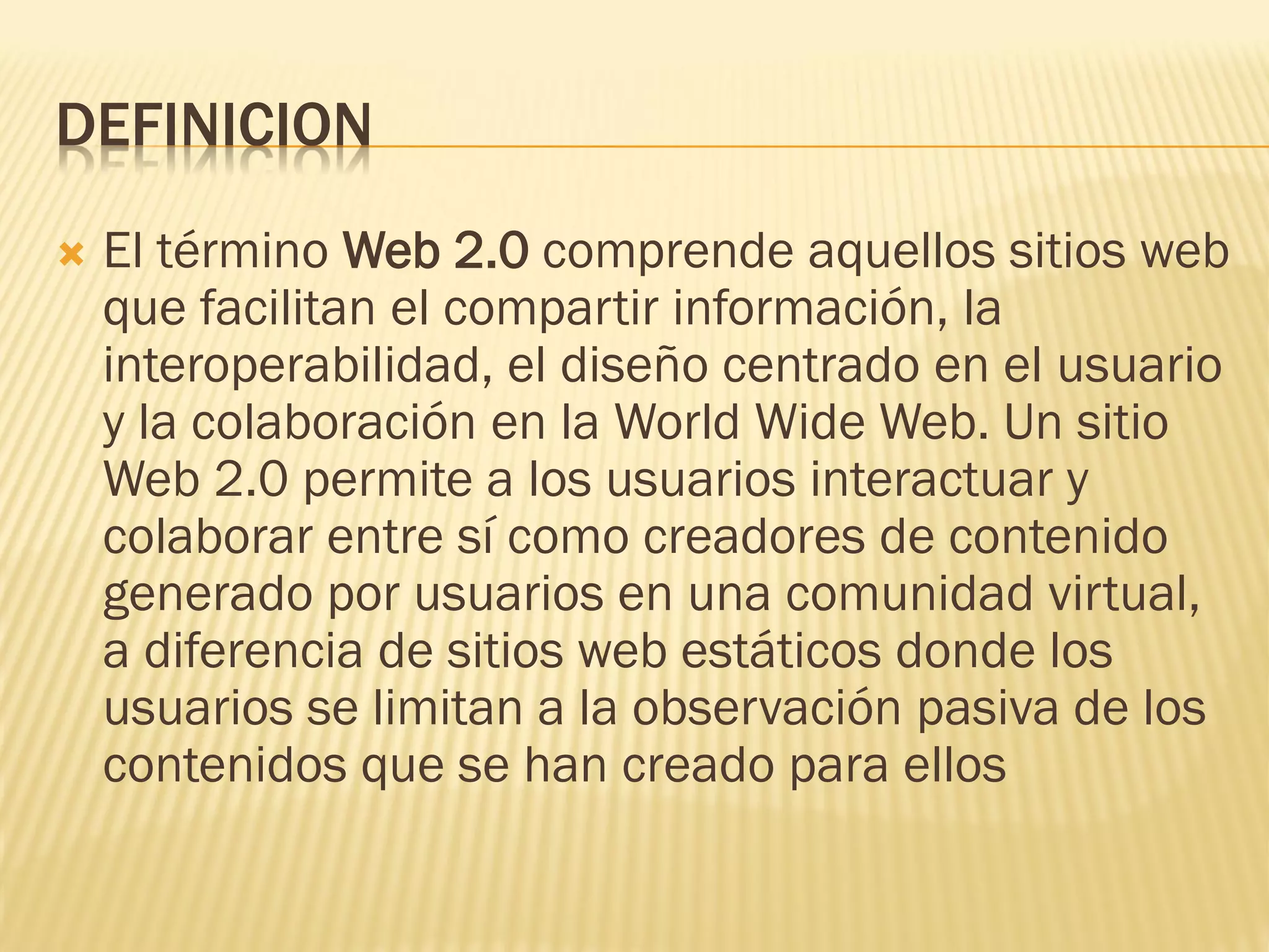 La Web 2.0 se refiere a sitios web que facilitan el compartir información y la colaboración entre usuarios, permitiendo que estos interactúen y creen contenido en comunidades virtuales, a diferencia de sitios estáticos donde solo observan contenido creado para ellos. Características clave incluyen el auge de blogs y redes sociales, contenido agregado por usuarios, y aplicaciones web dinámicas. Si bien ha democratizado la publicación de información, también plantea retos relacionados a los derechos de autor.