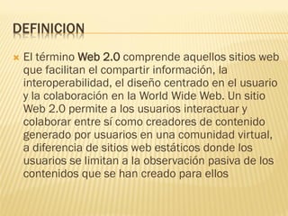 La Web 2.0 se refiere a sitios web que facilitan el compartir información y la colaboración entre usuarios, permitiendo que estos interactúen y creen contenido en comunidades virtuales, a diferencia de sitios estáticos donde solo observan contenido creado para ellos. Características clave incluyen el auge de blogs y redes sociales, contenido agregado por usuarios, y aplicaciones web dinámicas. Si bien ha democratizado la publicación de información, también plantea retos relacionados a los derechos de autor.