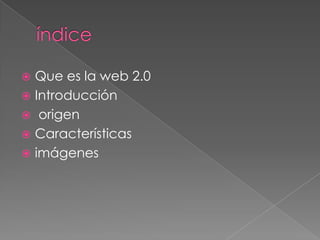 La Web 2.0 se refiere a sitios web que facilitan el compartir información, la interoperabilidad, el diseño centrado en el usuario y la colaboración entre usuarios. Esto incluye comunidades web, redes sociales, wikis y blogs donde los usuarios pueden crear y modificar contenido de forma colaborativa. La Web 2.0 se caracteriza por dar más importancia a la participación e inteligencia colectiva de los usuarios que a contenidos estáticos.