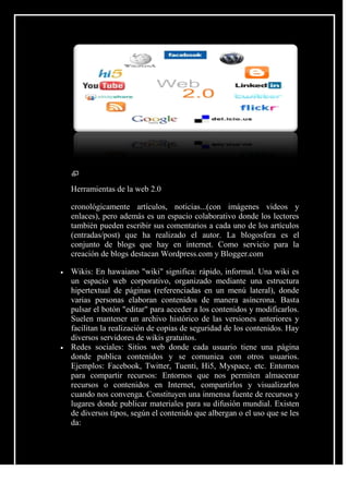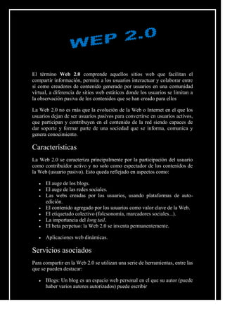 La Web 2.0 permite a los usuarios interactuar y colaborar como creadores de contenido en lugar de limitarse a observar pasivamente. Las características clave incluyen blogs, redes sociales, contenido generado por usuarios y etiquetado colectivo. Algunas herramientas comunes son blogs, wikis, redes sociales y plataformas para compartir documentos, videos, fotos y presentaciones.