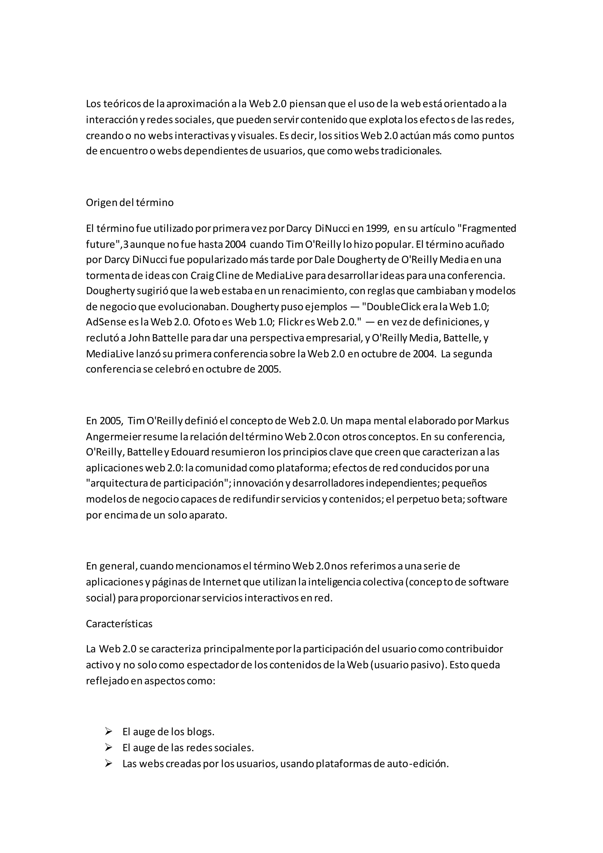 La Web 2.0 permite a los usuarios interactuar y colaborar como creadores de contenido en comunidades virtuales, a diferencia de sitios web estáticos. Los ejemplos clave de la Web 2.0 incluyen blogs, redes sociales, wikis y servicios para compartir videos y fotos que permiten a los usuarios publicar y etiquetar contenido de manera colaborativa. La Web 2.0 se caracteriza por priorizar la participación de los usuarios y el contenido generado por los usuarios sobre el contenido creado solo para ellos.