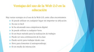 Este documento describe algunas ventajas del uso de la Web 2.0 en la educación, como que permite el aprendizaje en cualquier lugar y hora, fomenta la competencia digital y el autoaprendizaje, y sirve como método de interacción y continuación de la clase. También discute que la institución educativa cuenta con los recursos necesarios como laboratorios de computación e internet para implementar herramientas de la Web 2.0, mencionando algunas como Issuu, slideshare y youtube que podrían usarse en clases de educación inicial.