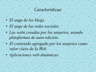 El documento describe Web 2.0 y sus características principales, como sitios que facilitan el compartir información y contenido generado por usuarios. Menciona herramientas populares de Web 2.0 como YouTube, Facebook y Wikipedia. Explica brevemente que Wikipedia es una enciclopedia en línea de acceso gratuito con millones de artículos en varios idiomas, y que YouTube es un sitio para compartir videos que también se puede usar con fines educativos.