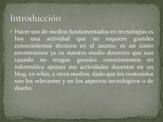 El documento describe las características y ventajas de la Web 2.0. Explica que la Web 2.0 permite el uso de herramientas como blogs, wikis y redes sociales para compartir información sin necesidad de grandes conocimientos técnicos. Además, la Web 2.0 facilita que internet pase de ser un espacio de solo lectura a uno de lectura y escritura colaborativa, donde los usuarios pueden clasificar y comentar contenidos compartidos.