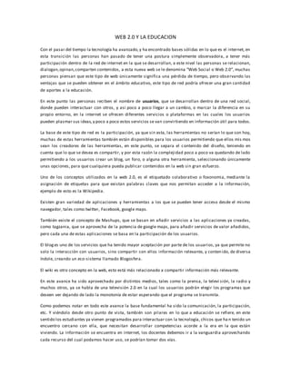 Este documento describe cómo la Web 2.0 y sus herramientas como blogs, wikis, redes sociales y servicios de almacenamiento de archivos multimedia han cambiado la naturaleza de Internet, permitiendo una mayor participación y colaboración entre usuarios. El autor argumenta que estas herramientas podrían aprovecharse en la educación, permitiendo a los estudiantes interactuar y compartir información relevante. Finalmente, el documento concluye que los docentes deben mantenerse actualizados sobre estas herramientas para integrarlas de manera efectiva en sus