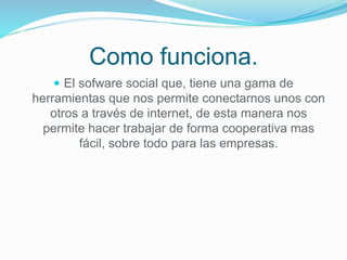El documento describe cómo las herramientas de software social permiten la colaboración a través de Internet entre empresas de forma más fácil. Estas herramientas WEB 2.0 ayudan a las empresas a tener una comunicación fluida, mejorar su visibilidad en el mercado, compartir conocimientos y recursos, realizar proyectos en común, y reducir costes. Las herramientas complementan la actitud colaborativa de la empresa pero no la sustituyen.