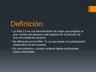 La Web 2.0 permite una mayor participación colaborativa de los usuarios a través de herramientas como blogs, wikis y redes sociales. Estas herramientas permiten a los usuarios crear y compartir contenido en lugar de solo consumirlo. La Web 2.0 también ha llevado a nuevas formas de ofimática en línea y herramientas de trabajo colaborativo que facilitan la edición y publicación compartida de documentos.
