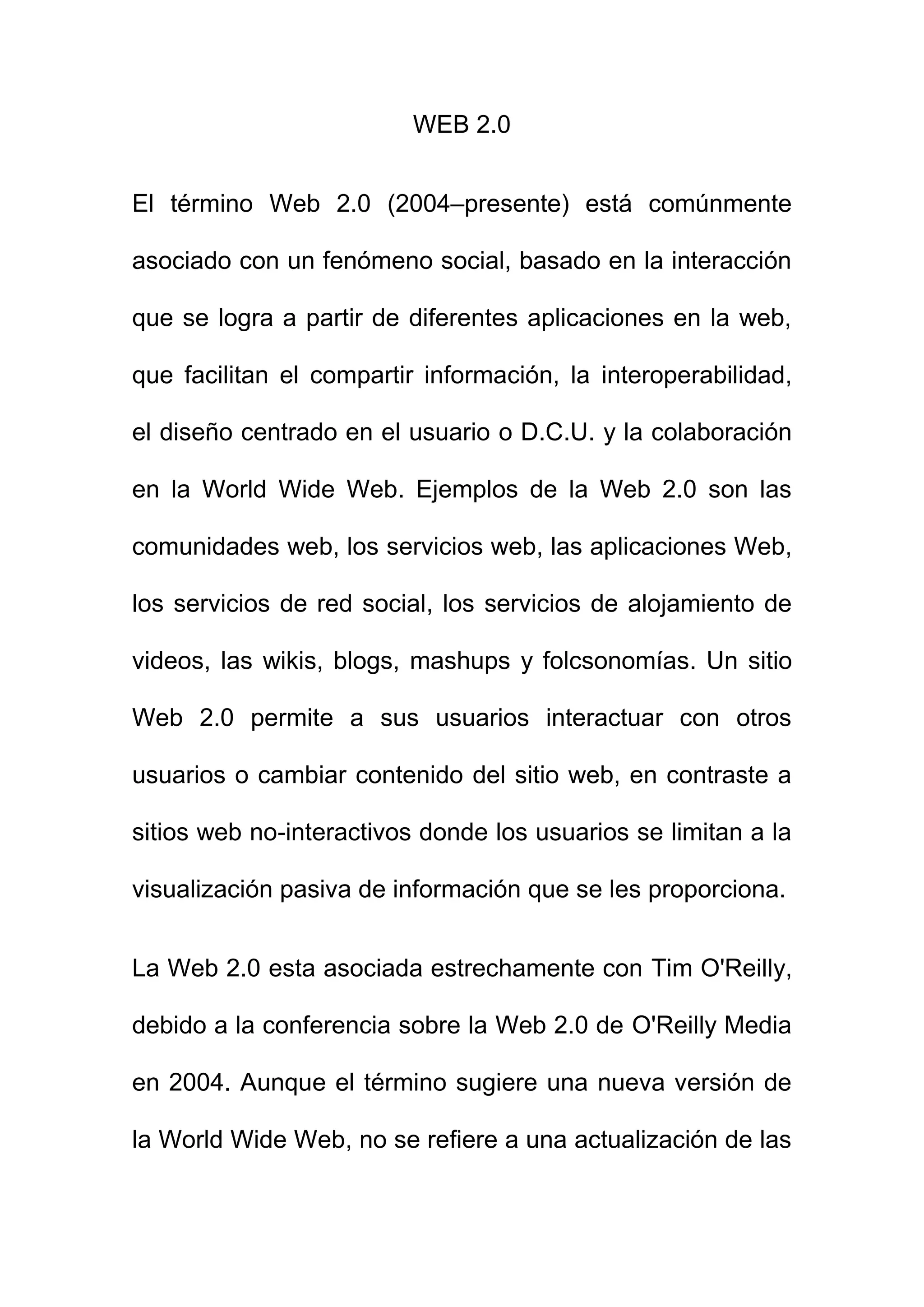 La Web 2.0 se refiere a una evolución de la World Wide Web hacia sitios más interactivos y centrados en el usuario, que facilitan el compartir y colaborar mediante aplicaciones como redes sociales, wikis y blogs. Algunos ejemplos clave de esta transición incluyen el paso de sitios estáticos a dinámicos actualizados por usuarios, y el cambio del enfoque en atraer visitas a explotar efectos de red e inteligencia colectiva.