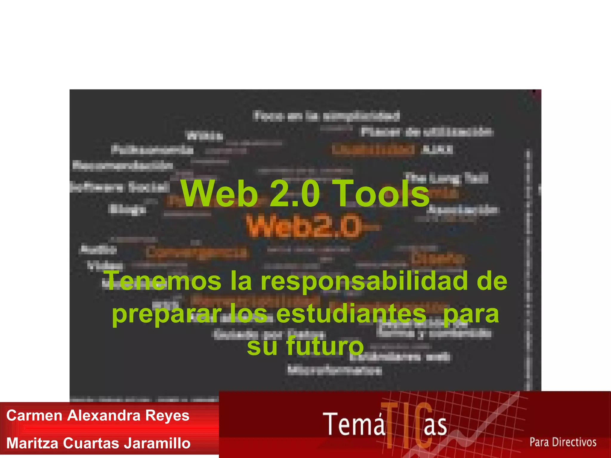 Este documento habla sobre las herramientas de Web 2.0 como blogs, wikis, podcasting y redes sociales que permiten a los usuarios añadir y compartir contenido. Describe que Web 2.0 se basa en una comunidad que fomenta la reutilización de materiales y apoya la creación de redes sociales a través de herramientas para comentarios y expresión. También menciona algunos ejemplos específicos de herramientas y sitios web de Web 2.0.