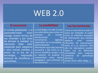 La Web 2.0 permite la interactividad entre agentes en la formación del individuo. El estudiante puede concebir ideas a partir de diferentes puntos de vista usando herramientas en la red. Integra elementos para mejorar la enseñanza de estudiantes y docentes creando espacios reflexivos.