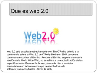 La Web 2.0 se refiere a cambios en cómo los desarrolladores y usuarios usan la Web, incluyendo el uso de herramientas como blogs y wikis para compartir información de forma colaborativa. La Web 2.0 promueve que los sitios sean más abiertos y permitan a los usuarios controlar y compartir su propia información a través de enlaces. Aunque no implica cambios técnicos, la Web 2.0 ha transformado cómo las personas usan e interactúan en la Web.