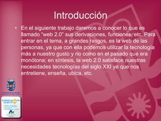 El documento describe las características de la Web 2.0, incluyendo la capacidad de los usuarios de interactuar y compartir contenido en plataformas como Facebook, Flickr y YouTube. También contrasta la Web 2.0 con la Web 1.0, en la que los usuarios solo podían leer contenido sin interactuar. Finalmente, introduce brevemente el concepto de Web 3.0 como una web impulsada por la inteligencia artificial.
