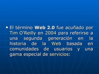 La Web 2.0 se refiere a una segunda generación de la Web basada en comunidades de usuarios y servicios como redes sociales, blogs, wikis y folksonomías que fomentan la colaboración y el intercambio de información entre los usuarios, convirtiendo a los consumidores en productores de contenido que comparten y almacenan de forma colaborativa.