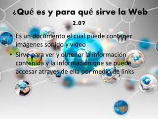 La Web 2.0 permite compartir información de manera dinámica e interactiva entre usuarios. Algunas herramientas comunes son YouTube para videos, SlideShare para presentaciones y Google Maps. La computación en la nube ofrece servicios y aplicaciones a través de Internet como Dropbox y Evernote. Esto provee movilidad, ahorro de costos y escalabilidad. Dropbox sería útil en el colegio para guardar trabajos de forma segura en línea.