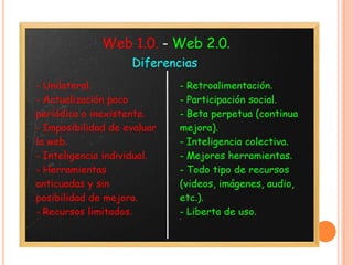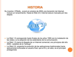 El documento describe la historia y características de la Web 2.0. La Web 1.0 corresponde al período hasta finales de los 90 cuando se instalaron las redes y se adoptaron los estándares de comunicación, mientras que la Web 1.5 marcó la llegada de Internet comercial. La Web 2.0 presenta la evolución de aplicaciones tradicionales enfocadas en el usuario final y características como ser una plataforma funcional, simple, ligera y social.