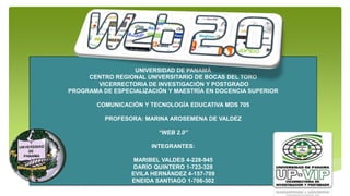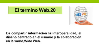 El documento describe las características clave de la Web 2.0, incluyendo la participación activa de los usuarios como contribuyentes de contenido, el uso de etiquetas sociales, y la importancia del contenido generado por los usuarios. También discute las consecuencias de la Web 2.0 como la democratización de los medios y la reducción de costos de publicación, así como las debilidades como el riesgo de incluir obras previas de otros autores sin permiso.