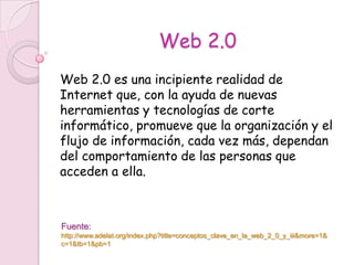 Web 2.0 promueve que la organización y flujo de información dependan del comportamiento de las personas que acceden a ella, utilizando nuevas herramientas y tecnologías. Zoho es un conjunto de aplicaciones web gratuitas desarrolladas por AdventNet, aunque muchas están en fase beta. Wikispace permite desarrollar aprendizaje colaborativo a través del navegador web, donde los usuarios pueden crear, modificar o borrar textos compartidos.