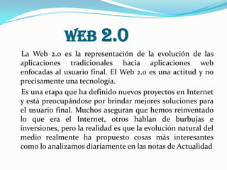 El documento habla sobre la Web 2.0, la cual representa la evolución de las aplicaciones tradicionales hacia aplicaciones web enfocadas al usuario final. No es una tecnología en sí, sino una actitud para desarrollar en Internet y brindar mejores soluciones para los usuarios. Algunas herramientas clave de la Web 2.0 son blogs, wikis y entornos para compartir recursos como documentos, videos y presentaciones. Las características principales son permitir a los usuarios hacer más que solo recuperar información y proporcionar datos e influir