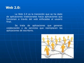 Este documento presenta una introducción a conceptos clave relacionados con la Web 2.0 y su impacto en la educación. Explica brevemente que la Web 2.0 se refiere a aplicaciones enfocadas en el usuario y la colaboración que reemplazan aplicaciones de escritorio, y define la ciudadanía digital como normas de comportamiento relacionadas con el uso de la tecnología. También discute cómo las TIC generan nuevos procesos de aprendizaje y la necesidad de que los recursos educativos se adapten a la globalización, y explic