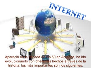 La evolución de Internet comenzó en la década de 1950 con el desarrollo del primer modem y teorías sobre la conmutación de paquetes. En los años 1960 y principios de los 70, ARPA desarrolló la red ARPANET, conectando universidades estadounidenses. En los 80 y 90, TCP/IP se estableció como el protocolo dominante y la World Wide Web trajo una nueva era de acceso a la información. En la actualidad, las tecnologías de Web 2.0 y 3.0 están transformando la red en una plataforma más social