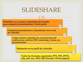 El documento describe dos sitios web para compartir documentos: SlideShare y Scribd. SlideShare permite compartir presentaciones en formatos como PowerPoint, PDF y documentos de Word con redes en LinkedIn y Facebook. Scribd permite a los usuarios publicar y compartir documentos de varios formatos en una página web. Ambos sitios web permiten a los usuarios subir contenido existente de sus cuentas y mostrarlo en múltiples plataformas para obtener más visitas.