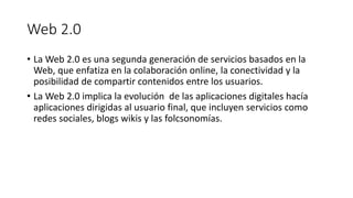 El documento describe las características clave de la Web 2.0, incluyendo su énfasis en la colaboración en línea, la conectividad y el compartir contenido entre usuarios. Luego enumera algunas herramientas Web 2.0 populares como Google Drive, redes sociales como Facebook y Twitter, mapas mentales creados con herramientas como MindMeister, y presentaciones compartidas a través de plataformas como Prezi y SlideShare. Finalmente, menciona podcasts, blogs y wikis como otras aplicaciones Web 2.0 útiles para la educación
