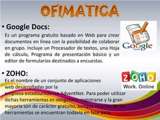 Este documento describe diferentes herramientas y plataformas web 2.0 como Google Docs, Zoho, SlideShare, WordPress, Blogger, Wetpaint, Wikispaces, Blip.TV, YouTube, Picasa, Flickr, Odeo, Digg, Chuza, Twitter, Pownce, Panoramio, Google Maps, Ning y Elgg.