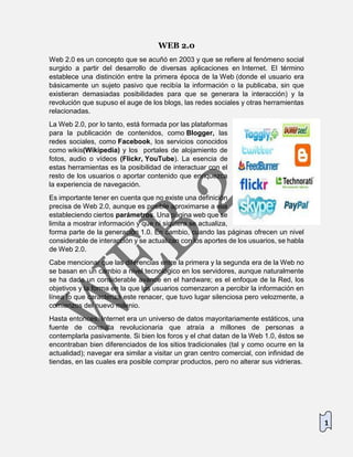 El documento define Web 2.0 como el fenómeno social surgido a partir del desarrollo de aplicaciones en Internet que permiten una mayor interacción entre usuarios, como blogs, redes sociales y servicios de publicación de contenidos. La Web 2.0 se caracteriza por ofrecer niveles considerables de interacción entre usuarios y actualizaciones constantes con aportes de los mismos. Esto representó un cambio en la forma en que los usuarios perciben y usan la información en línea.