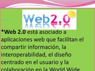 El documento describe la Web 2.0 como una evolución de la Web 1.0 que permite a los usuarios interactuar y colaborar como creadores de contenido en lugar de limitarse a la observación pasiva. Ejemplos de la Web 2.0 incluyen comunidades web, redes sociales, wikis y blogs que facilitan el compartir información y la interacción entre usuarios. Aunque el término sugiere una nueva versión de Internet, realmente se refiere a cambios en cómo los desarrolladores y usuarios utilizan la Web de forma más social y