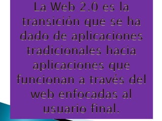 El documento describe los principios clave de la Web 2.0, incluyendo la participación de los usuarios, la importancia de la información y la innovación descentralizada. Luego proporciona ejemplos de cómo servicios como Flickr, Napster y Wikipedia ilustran la evolución hacia la Web 2.0. Finalmente, discute las tecnologías como Ajax que permiten las aplicaciones Web 2.0 y cómo la Web 2.0 enfatiza una actitud de evolución continua más que una tecnología específica.