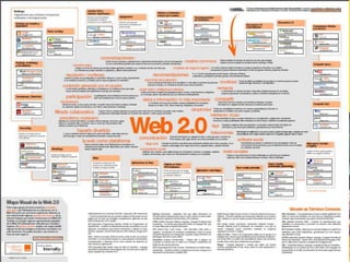 El documento describe la Web 2.0 y las herramientas asociadas. Explica que la Web 2.0 permite a los usuarios publicar directamente contenido en la web a través de blogs, wikis y otras herramientas. Además, categoriza las herramientas de la Web 2.0 como gestores de contenido, RSS, redes sociales, compartición de imágenes y videos, y mapas mentales. Finalmente, proporciona ejemplos populares de herramientas de la Web 2.0 en cada categoría.